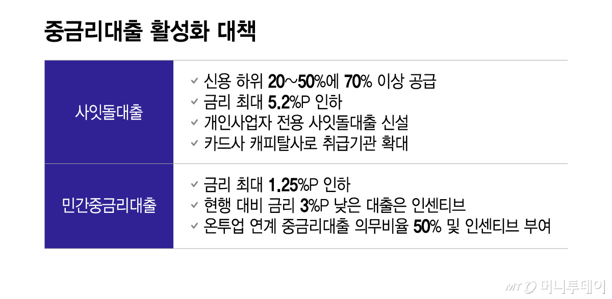 올 하반기부터 신용점수 하위 50% 이하의 중저신용자에게 공급되는 사잇돌대출과 민간중금리대출 금리가 각각 최대 5.2%P(포인트), 1.25%P 인하된다.