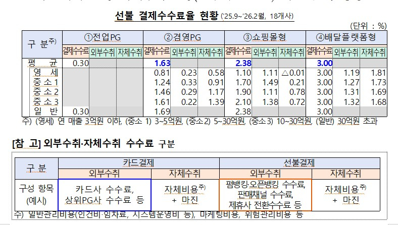 특히 카드 결제수수료율은 유형별로 평균 1.80~2.08%로 격차가 크지 않았으나 선불결제는 4개 유형별로 차이가 났다. 쇼핑몰형과 배달플랫폼형이 각각 2.38%, 3.00%로 전업 및 겸영의 0.30%, 1.63% 대비 2배 전후로 높게 형성됐다.