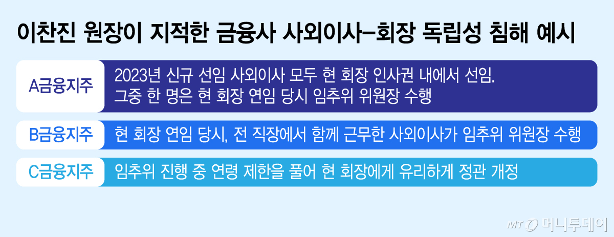 아울러 이 원장은 B금융지주의 현 회장이 연임할 당시 이전 직장에서 같이 근무한 사외이사가 임추위 위원장을 맡은 점도 독립성이 약화된 사례로 봤다. 임추위가 진행되는 과정에서 C금융지주가 정관상 회장의 연령 제한을 풀어 현 회장에게 유리하게 개정한 경우도 지적 대상이 됐다.