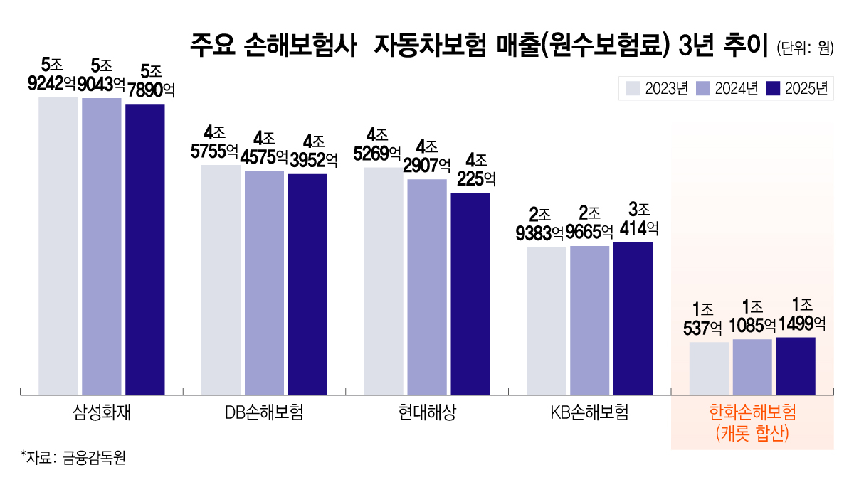 손보업계는 그간 자동차보험 5대 손보사로 한화손보가 아닌 메리츠화재를 포함했다. 하지만 지난해 10월 한화손보가 캐롯손보를 흡수합병한 뒤 판도가 달라졌다. 지난해말 기준 한화손보(8164억원)와 캐롯손보(3335억원)의 합산매출(원수보험료)은 1조1499억원으로 메리츠화재(7997억원)를 크게 앞질렀다.