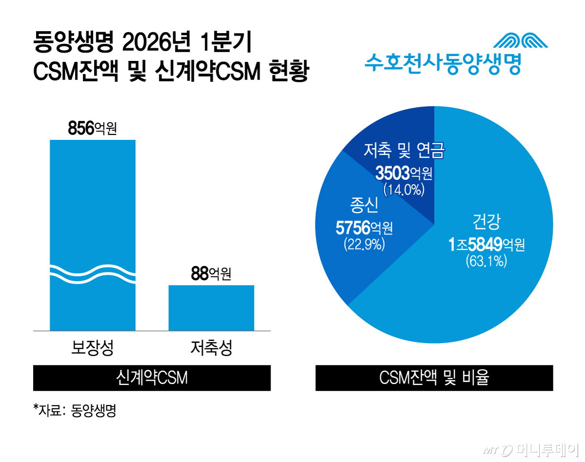 실제로 1분기 기준 보험계약마진(CSM) 잔액 2조51000억원 가운데 저축 및 연금 CSM은 3503억원으로 전체 14%에 그쳤다. 반면 건강보험 CSM은 1조5849억원으로 63%, 종신보험 CSM은 5756억원으로 22.9%를 차지했다. 동양생명은 최근 손해율이 높은 건강보험 비율을 낮추고 종신보험 비율을 높이는 추세다. 1분기 종신보험 신계약 CSM은 321억원으로 전년 244억원 대비 32.9% 성장했다. 생보사들은 주력 상품인 종신보험 판매실적이 가장 중요한 지표다.