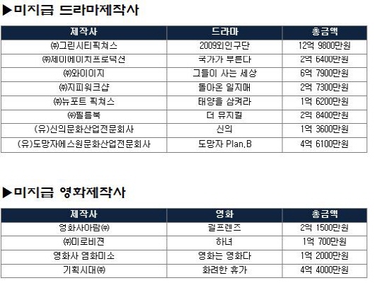 구체적으로 '그들이 사는 세상'(제작사 와이이지)이 6억7927만원으로 가장 많았고 '도망자 Plan. B'(도망자에스원문전사) 4억6130만원, '더 뮤지컬'(필름북) 2억8480만원, '돌아온 일지매'(지피워크샵) 2억7320만원, '국가가 부른다'(제이에이치프로덕션)가 2억6410만원 순으로 나타났다. 지난해 7월 고 김종학 PD의 자살사건으로 불거진 '신의'는 미지급 출연료가 1억3680만원이다.