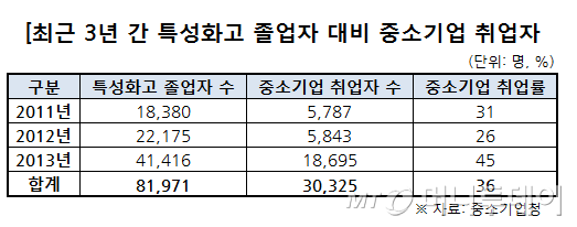 문제는 이 사업이 실시된 후 첫 졸업생이 배출된 2011년부터 지난해까지 3년간 특성화 졸업생 중 중소기업에 취업한 학생은 3만325명으로 전체의 36%에 그쳐 취업율이 현격히 떨어진다는 점이다.