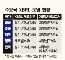XBRL은 기업의 재무회계정보를 보고하기 위한 국제표준 웹언어다. 재무제표 각 계정항목에 표준화된 식별코드를 부여해 자동적으로 이를 DB화하고 다양한 분석을 가능하게 해주는 방식이다. 미국은 지난해 증권거래법을 개정해 기업들에 XBRL 기반 보고를 의무화했다. 또 이달부터는 XBRL 기반의 보고를 준수하지 않으면 증권거래위원회(SEC)가 제재에 나서기로 했다. 일본과 중국도 최근 정기보고서 제출시 XBRL을 의무화했다. 영국은 세무보고서에 XBRL을 의무화해 탈루·탈세를 추적한다.