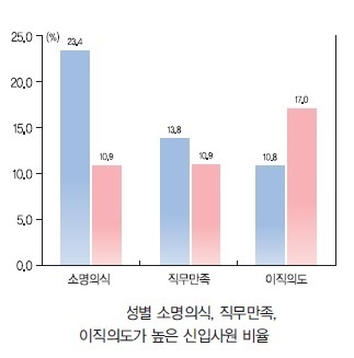 성별로 살펴보면 남자 신입사원은 여자보다 '소명의식'과 '직무만족도'가 높은데다 직장을 옮길 생각도 적었다. 실제로 남자의 소명의식은 23.4%로, 여자인 10.9%와 비교하면 두 배 이상으로 조사됐다.