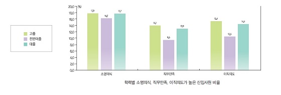 학력별로 봤더니 소명의식은 고졸(17.9%), 대졸(17.7%), 전문대졸(16.2%) 순으로 높았다. 직무만족도 역시 고졸이 14.1%로 가장 높은데 이어 대졸 12.9%, 전문대졸 9.5% 순으로 조사됐다. 그러나 이직할 생각은 고졸이 15.4%로, 대졸 14.4%, 전문대졸 10.5%를 앞섰다.