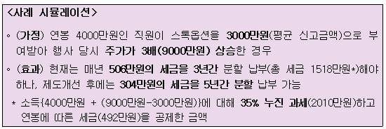 예컨대 연봉 4000만원인 벤처기업 직원이 스톡옵션을 3000만원어치 받았고 주가가 3배(9000만원) 상승한 경우 현재는 매년 506만원(총 1518만원)의 세금을 3년간 분할 납부해야 했다. 제도 개선 후에는 분할납부 기간이 5년으로 연장돼 연간 부담해야 할 세금이 부담이 304만원으로 줄어든다.