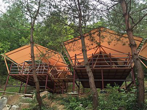 8월에 오픈하는 평창 ‘쉼더하기’ 글램핑 파크는 산과 나무의 높낮이를 고려, 평지가 아닌 1.5m 지상 나무 사이에 독채형 글램핑 텐트를 설치해 자연의 웅장한 품을 가까이서 느낄 수 있도록 설계되어 있다.