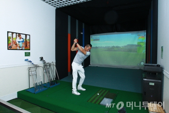 홍콩 국제공항내에 설치된 골프존의 골프시뮬레이터 '비전'시스템./사진=골프존