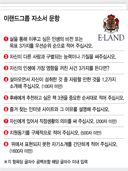 고집일까, 소신일까, 자신일까? 1년마다 자소서 문항을 바꾸는 기업이 비일비재하고, 심지어 상반기와 하반기 자소서 문항이 다른 기업도 많은데, 이랜드는 2009년에 나왔던 신입사원 공채의 자소서 문항과 지금 2015년 하반기에 나온 자소서 문항이 일치한다. 몇 년간 같은 자소서 문항으로 신입들을 채용해 왔다는 것이다.