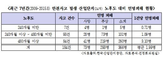낡은 산업단지에서 발생한 안전사고 일수록 인명피해가 큰 것으로 나타났다.