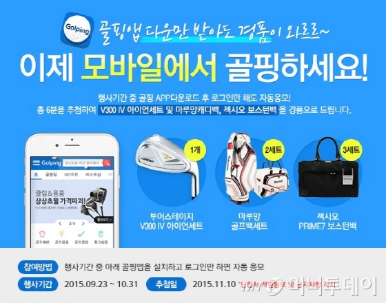 특히 서비스 오픈을 기념해 앱 다운로드 후 로그인한 고객을 추첨해 투어스테이지 V300 남성용 아이언세트 1개, 마루망 골프백, 보스턴백 2세트, 젝시오(XXIO) PRIME7 아이언용 보스턴백 3세트를 증정한다. 이번 이벤트는 골핑 앱에 로그인한 고객은 모두 자동으로 응모하며 로그인 고객을 대상으로 무작위 추첨한다.