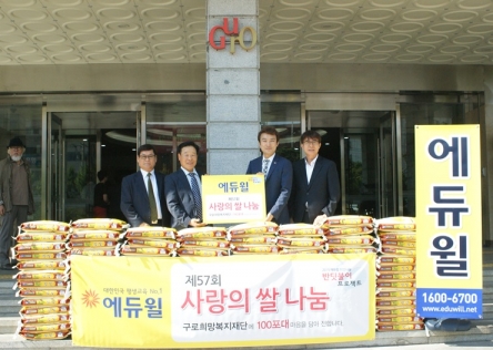 종합교육기업 ㈜에듀윌(대표 양형남, eduwill.net)은 지난 24일(목) 구로희망복지재단에 ‘사랑의 쌀’을 기증했다. 2011년 1월부터 시작된 에듀윌의 ‘사랑의 쌀’ 나눔은 매월 꾸준히 진행되어 이달로 57회째를 맞는다.