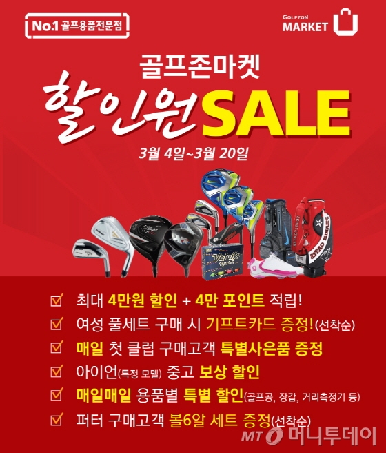할인원 세일은 오는 20일까지 진행한다. 골프클럽·골프볼·골프화·캐디백·거리측정기 등 매일 정해진 골프용품을 할인 가격으로 판매한다. 중고 아이언 세트 보상 할인도 실시한다.