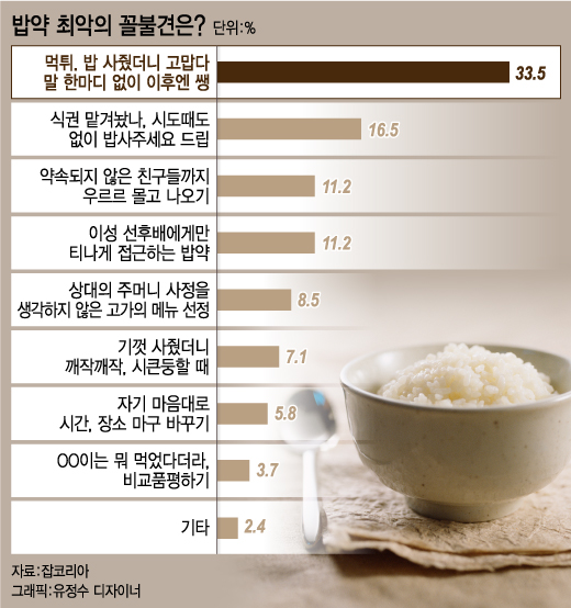 그밖에 ‘상대의 주머니 사정을 고려치 않은 고가의 메뉴를 선정(8.5%)’하거나 ‘기껏 사줬더니 깨작깨작, 시큰둥하기(7.1%)’, ‘자기 마음대로 시간과 장소를 마구 바꾸기(5.8%)’, ‘다른 선배가 사준 메뉴와 비교하기(3.7%)’ 등도 밥약 이후 꼴불견으로 전락하는 지름길로 꼽혔다.