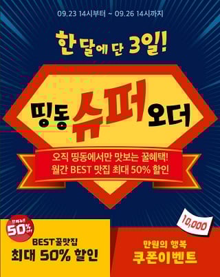슈퍼오더 이벤트는 한 달에 한 번 3일 동안만 진행되는 이벤트다. 비비고 청담CGV점, 불고기브라더스 강남점, 서가앤쿡, 가장맛있는족발 신림역점, 공수간 송파점, TGIF 잠실점, 도쿄등심, 전주행 옥수점, 킹콩떡볶이 금호점 등의 맛집 메뉴를 띵동으로 배달하면 최대 50% 할인하는 행사다. 또한 이벤트 기간 주문 고객 가운데 100여명을 추첨, 1만원 쿠폰을 지급한다.