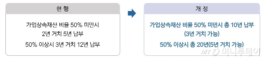 다만 정부는 가업상속 연부연납 기간을 연장하고 거치기간을 선택할 수 있도록 했다. 가업상속재산 비율 50% 미만시 2년 거치 5년 납부였던 걸 3년 거치 7년 납부가 가능해졌다. 50% 이상일 경우엔 5년 거치 15년 상환까지 가능하다.