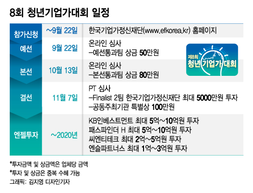 업체당 최대 28억5000만원의 투자 기회를 걸머쥘 수 있는 제8회 청년기업가대회의 참가신청 메뉴가 오픈됐습니다. 참가신청은 한국기업가정신재단 홈페이지 '△청년기업가대회→△제8회 대회신청' 메뉴를 통하거나 △'제8회 청년기업가대회' 로고 클릭을 통해 가능합니다.