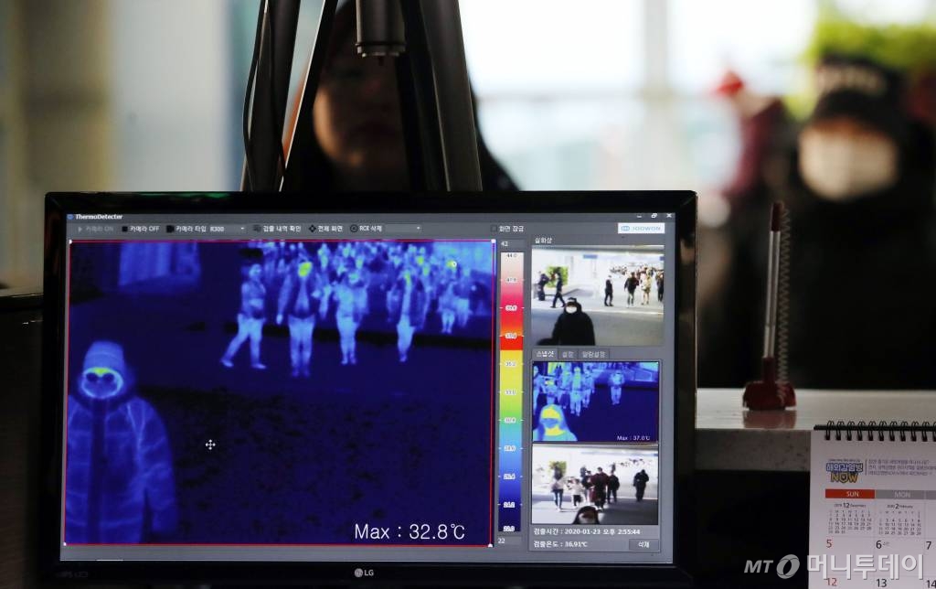 ![[인천공항=뉴시스]박미소 기자 중국발 신종 코로나바이러스로 인한 '우한 폐렴' 사망자가 중국에서 증가하는 가운데 마스크를 쓴 시민들이 23일 오후 인천국제공항 제1여객터미널 입국장 고정 검역대 열화상 모니터 앞을 지나가고 있다. 2020.01.23. misocamera@newsis.com](https://thumb.mt.co.kr/cdn-cgi/image/f=avif/21/2020/01/2020012418491539168_1.jpg)