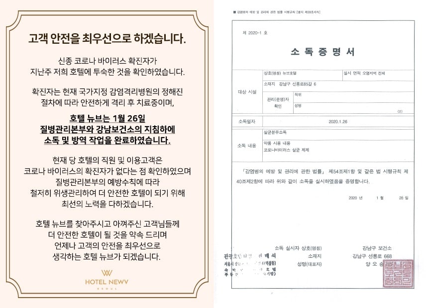총지배인은 "이미 강남보건소에서 26일 소독·방역을 완료해 영업에 문제가 없다고 확인서까지 받아왔다"며 "그래도 고객 입장에서는 우려가 클 수 있어 내일(29일) 다시 자체적으로 호텔 전체를 꼼꼼히 소독하고 재점검키로 했다"고 강조했다. 또한 로비에는 손 세정제와 마스크를 비치해 체크인할 때부터 고객의 안전을 개선했다고 덧붙였다.