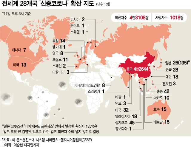 한편 11일 오후 4시 기준 국내 신종코로나 환자는 1명 추가돼 28명이다. 30세 중국인 여성인 28번 환자는 3번 환자의 밀접접촉자로 10일 양성 판정을 받고 일산 명지병원에 격리돼 치료를 받고 있다. 의심환자는 3601명으로 이중 2736명은 검사 결과 음성 판정을 받았고 나머지는 검사가 진행 중이다.