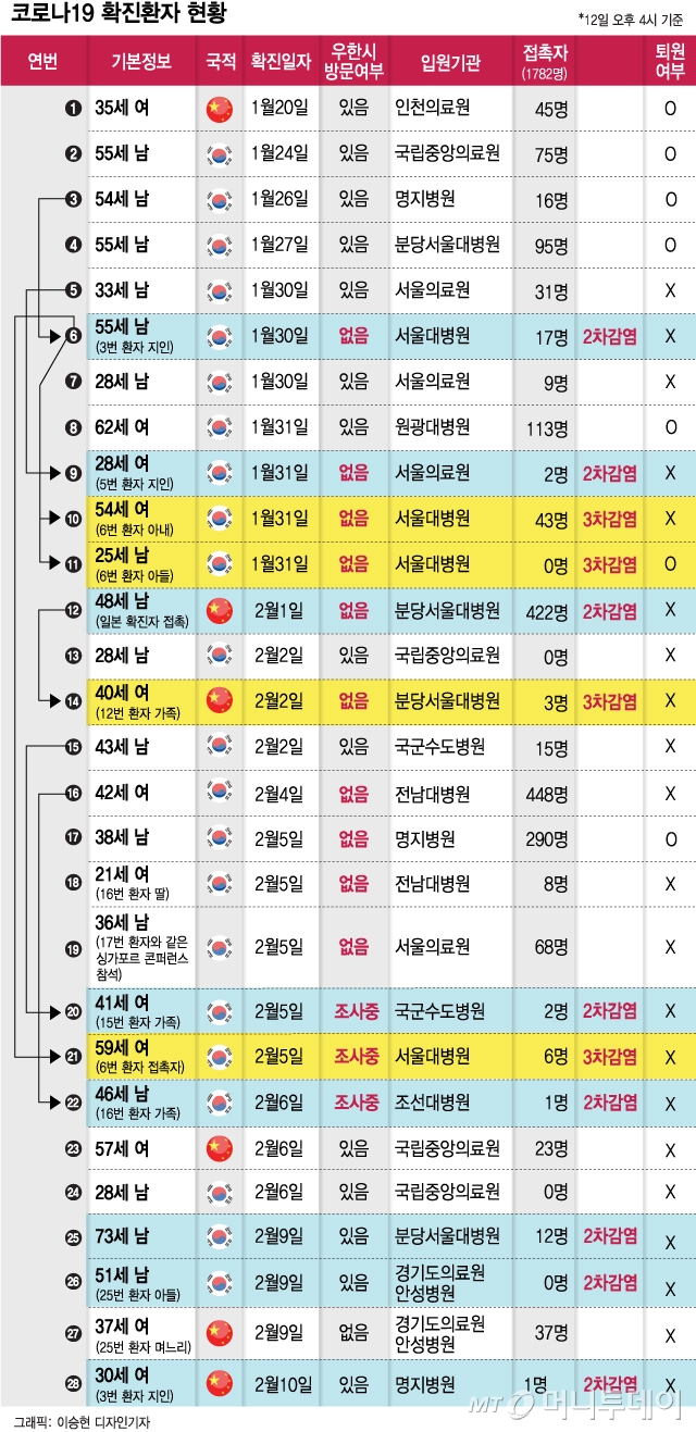 잠복기 14일이 지나 확진 판정을 받은 28번 환자는 입원 후에도 별다른 증상이 없는 것으로 확인됐다. 28번 환자는 중국 우한시에서 지난달 20일 귀국한 3번 환자의 접촉자로, 지난달 25일 3번 환자와 마지막 접촉을 한 지 17일 만에 확진 판정을 받았다.