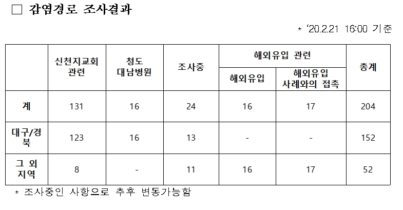 질병관리본부 중앙방역대책본부(중대본)는 21일 오후 4시 기준 국내 확진 환자 204명의 감염경로를 분석한 결과를 발표했다.