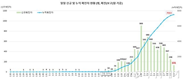 질병관리본부 중앙방역대책본부(방대본)는 10일 0시 기준 코로나19 확진 환자가 전날 같은 시간보다 131명 증가한 7513명을 기록했다고 밝혔다. 격리해제된 확진 환자는 247명으로 전날보다 81명 늘었고 사망자 수는 3명 증가한 54명을 기록했다.