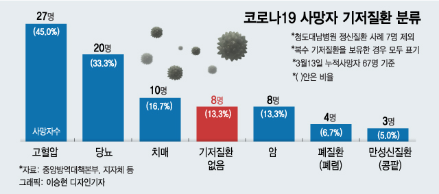 13일 질병관리본부 중앙방역대책본부와 지방자치단체 등에 따르면 최근 기저질환 없는 사망자가 증가하면서 폐 질환을 넘어 암 기저질환 사망자와 숫자가 같아졌다. 8명으로 전체 사망자의 13.3%에 이른다. 이날 기준 사망자 67명 중 대규모 사망자가 나온 청도 대남병원 정신질환 병동 사례 7명을 제외한 60명에 대한 기저질환 분류에 따른 결과다.