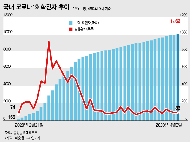 질병관리본부 중앙방역대책본부(방대본)은 3일 코로나19 온라인 정례브리핑에서 이날 0시 기준 국내 코로나19 확진 환자가 전날보다 86명 증가한 1만62명으로 집계됐다고 발표했다. 이중 59.8%인 6021명이 격리해제됐고 174명이 사망했다.