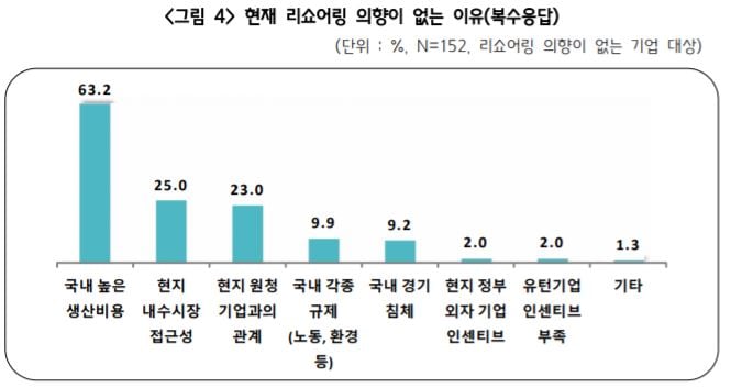 리쇼어링 의향이 없는 이유로는 '국내 높은 생산비용(63.2%, 복수응답)'이 가장 많이 꼽혔다. 이어 '현지 내수시장 접근성(25.0%)', '현지 원청기업과의 관계(23.0%)' 등 해외시장이 가진 장점도 리쇼어링을 막는 이유로 거론됐다. '노동, 환경 등 국내 규제(9.9%)', '국내경기 침체(9.2%)' 등 국내 상황도 거론됐다.