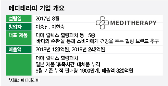 특히 지난해 시작된 일본 불매운동은 메디테라피에 큰 기회로 다가왔다. 일본 제품의 대체상품으로 힐링패치가 주목받으며 판매가 가파르게 증가했다. 힐링패치는 지난 6월말 기준 누적 판매량 1900만장, 누적 매출액 320억원을 돌파했다.