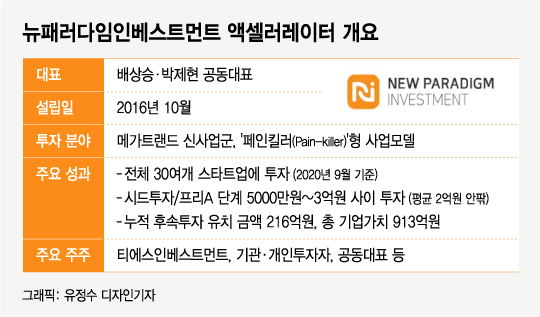 뉴패러다임은 2016년 설립돼 이제 5년차에 접어들었다. 스타트업 경영에 직·간접적으로 참여하는 컴퍼니빌더형 액셀러레이터 겸 사업화 전문 투자사를 표방한다. 5000만~3억원의 창업 초기(시드 투자)부터 성장 단계별 보육·연계투자를 지원한다. 배 대표는 "미국 벤처캐피탈(VC) 페녹스와 연계한 페녹스코리아로 시작한 이후 순수 국내 자본 액셀러레이터로 독립, 지난해에는 국내 중견 VC인 티에스인베스트먼트의 자회사로 편입되면서 다양한 투자 네트워크를 쌓아왔다"고 설명했다.