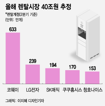 40조원 규모로 커지고 있는 렌탈시장의 경쟁이 치열하다.LG전자(108,300원 ▼500 -0.46%)등 대기업까지 렌탈시장에 본격적으로 뛰어들고 있는 가운데 선두 코웨이에 이어 2위 자리를 차지하기 위한 각축전이 펼쳐지고 있다.