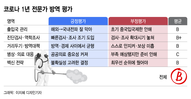 정부가 코로나19(COVID-19) 방역대응 평가에서 'B학점'을 받아들었다. 코로나19 국내 발생 1년을 맞아 머니투데이가 감염내과 교수 등 보건의료 전문가를 대상으로 한 조사에서다.