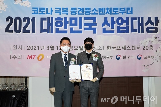 최재혁 글로싸인 차장(사진 오른쪽)이 12일 한국프레스센터에서 열린 머니투데이 주최의 '2021 제7회 대한민국 산업대상'에서 '스마트 전자계약 서비스' 부문 'K-스타트업대상 2년 연속상'을 수상하고 박동원 머니투데이 사장과 기념 촬영 중이다.