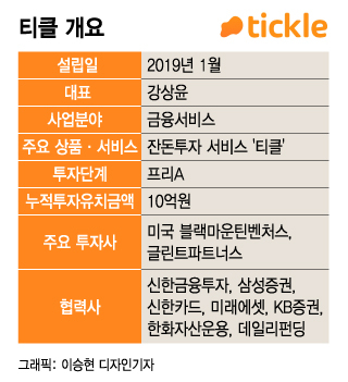 2019년 1월 설립한 티클은 동명의 잔돈 투자서비스 어플리케이션(앱)을 개발한 스타트업이다. 사용자가 앱과 연동한 카드로 결제할 때마다 1000원 미만의 잔돈이 자동으로 저축 및 투자되는 방식이다. 이를테면 편의점에서 1800원을 결제하면 200원이, 까페에서 8500원을 결제하면 500원의 잔돈이 사용자의 통장에서 '티클 저금통'으로 자동이체·저축된다. 사용자가 잔돈의 2배, 3배를 저축하도록 설정할 수도 있다. 이렇게 잔돈을 모아서 6개월간 200만~300만원을 저축한 사례도 있다.