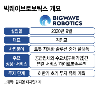 지난해 9월 설립한 빅웨이브로보틱스는 로봇 솔루션 중개 플랫폼을 개발한 스타트업이다. 이 회사에서 개발한 플랫폼 '마이로봇솔루션'은 산업·업종·공정별로 적용할 수 있는 가장 적절한 로봇 도입방안을 찾아준다. 김민교 빅웨이브로보틱스 대표는 "국내 뿐 아니라 전세계 로봇 정보망을 구축해 실제 사업장에서 필요한 로봇을 효율적으로 도입할 수 있도록 돕는 글로벌 최대 로봇 중개 플랫폼으로 자리매김하는 게 목표"라고 밝혔다.