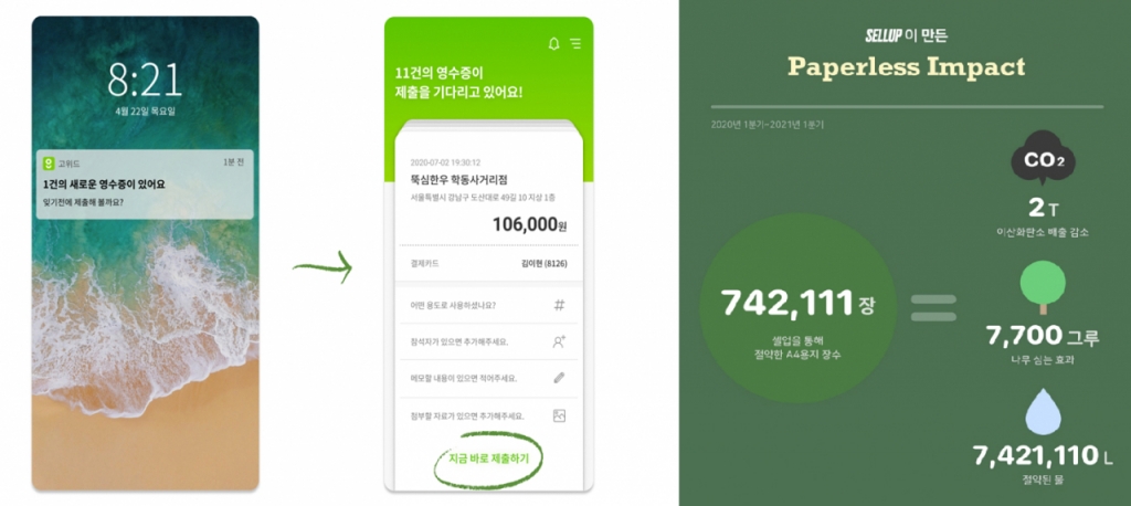 스타트업 전용 금융 서비스를 제공하는 고위드는 법인카드 사용 영수증을 모바일 앱을 통해 제출할 수 있도록 했다. 모바일 영수증으로 대체하면 연간 14만건에 달하는 종이 영수증을 절약할 수 있을 것으로 추산된다.