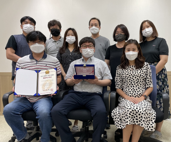 백경래 더마젝 대표(사진 앞줄 가운데)와 임직원들이 머니투데이 주최의 '2021 제7회 대한민국 리딩기업대상'에서 '마이크로니들 패치' 부문 '제품혁신대상'을 수상한 뒤 기념 촬영 중이다.