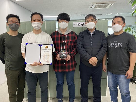 원유준 아이시큐어 대표(사진 맨 왼쪽)가 머니투데이 주최의 '2021 제7회 대한민국 굿컴퍼니대상'에서 '정보보안 컨설팅' 부문 'IT서비스대상'을 수상하고 임직원들과 기념사진을 찍고 있다.
