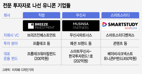 10일 관련업계에 따르면 부동산 플랫폼 직방과 패션 플랫폼 무신사, 콘텐츠 제작사 스마트스터디는 모두 VC를 자회사로 설립해 운영 중이다. 각각 프롭테크(부동산과 기술 융합)부터 패션 이커머스, 애니메이션·게임 등 콘텐츠 분야에 전문적으로 투자해 유망 스타트업을 발굴하는데 주력하고 있다.