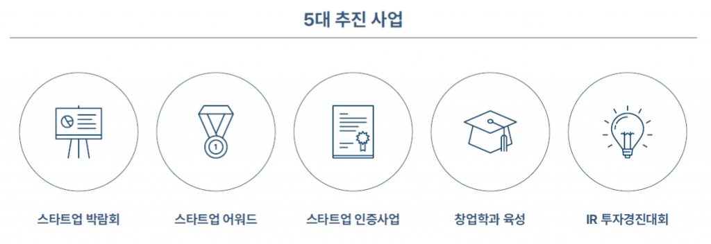 이를 위해 5대 추진 사업으로 △스타트업 박람회 △스타트업 어워드 △스타트업 인증사업 △전국 대학교 창업학과 육성·신설 △투자연계 전국 IR(기업설명회) 투자경진대회 등을 진행한다.