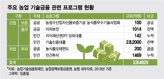 농업계에 따르면 국내 농업 기술금융 지원 프로그램 중 보증·융자 방식은 2조3256억원(2019년 기준)이다. 민간 차원의 기술신용대출이 2조2000억원으로 가장 크다. 반면 투자 방식은 1669억원에 그쳤다. 농업 기술금융의 90% 이상이 보증·융자 방식에 의존하고 있는 셈이다.
