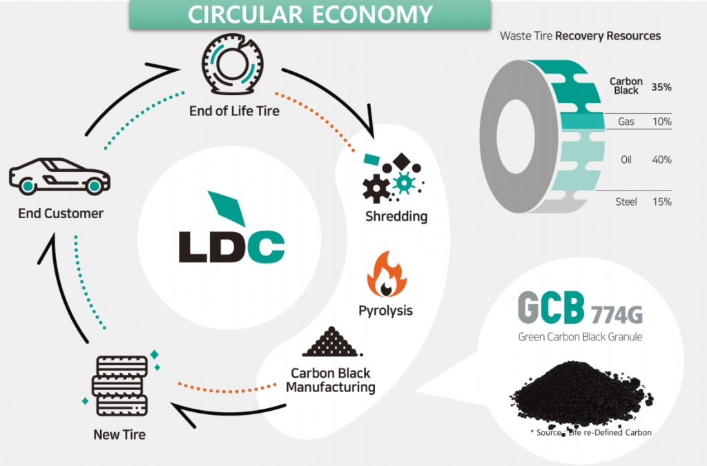엘디카본의 영문명인 LDC에는 '사람과 지구의 지속가능한 삶을 위한 탄소자원 순환(Life re-Defined Carbon)'이라는 의미가 담겨 있다. 다양한 폐기물 중 우선 폐타이어에 집중해 순환자원 소재를 제조하고 있다.