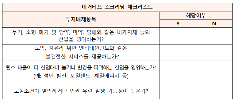 네거티브 스크리닝 평가기준은 유엔(UN) 책임투자원칙(PRI)을 준용해 △무기, 마약, 술·담배 등 비가치재 생산·유통 등 산업을 영위하는지 △도박·성윤리 위반 서비스를 제공하는지 △탄소배출이 타 산업보다 높거나 환경을 파괴하는지 △노동조건이 열악하거나 인권 유린 발생 가능성이 높은지 등 4가지로 구성됐다.