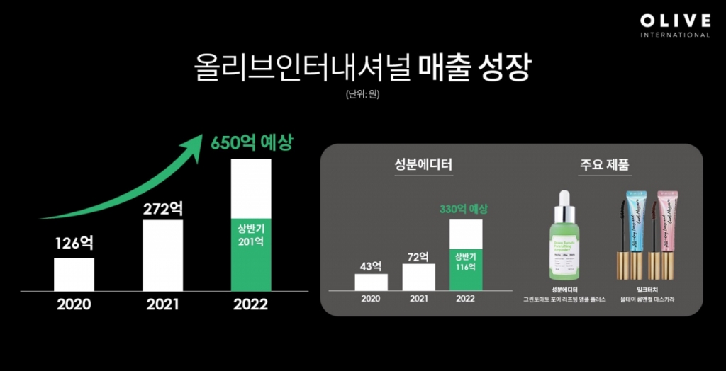 올리브인터내셔널은 성분에디터의 올해 목표 매출액을 330억원으로 설정하고 하반기 지속적인 성장을 이어가겠다는 계획이다. 해외 매출액은 뷰티·이너뷰티 브랜드 밀크터치의 일본 매출이 확대돼 21억5000만원을 기록했다.