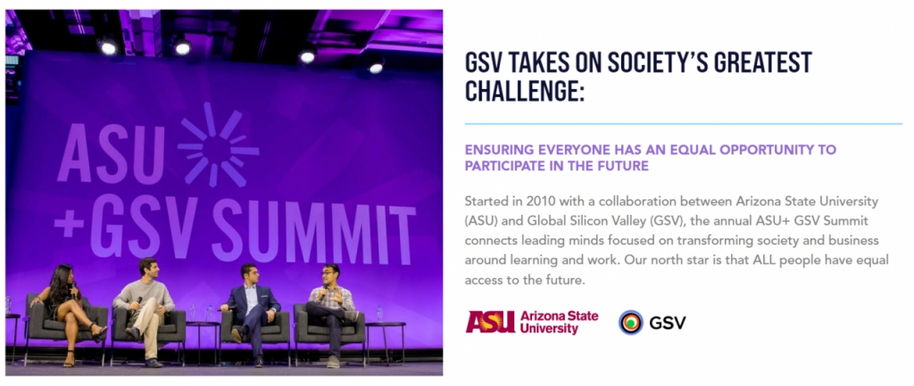 ASU+GSV 서밋에는 버락 오바마와 조지 부시, 빌 클린턴 등 미국의 전직 대통령을 비롯해 빌 게이츠 마이크로소프트 창업자와 리처드 브랜슨 영국 버진그룹 창업자 등 교육에 관심 있는 다양한 분야의 글로벌 리더들이 주요 연사로 참여해왔다.