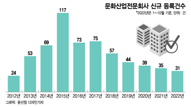올해 10월 기준 콘진원에 신규 등록된 문전사는 31개다. 2019년 44개, 2020년 39개, 2021년 35개 순으로 매년 줄어드는 추세다. 2015년 117개와 비교하면 4분의 1 수준이다.