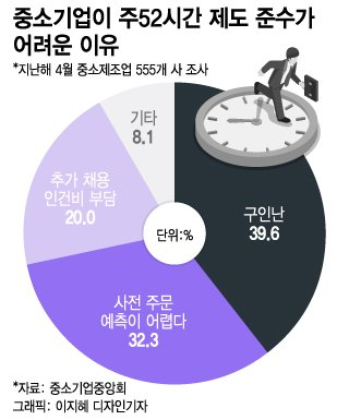 중소기업중앙회가 지난해 4월 중소제조업 555개 사를 조사하니 30~49인 기업의 52.2%, 50~299인 기업의 52.6%가 '주52시간제 준수에 어려움을 겪는다'고 했다. 32.3%가 "사전 주문 예측이 어렵다"는 점을 이유로 꼽았다. 중소기업들은 협력사 구조로 대기업 주문을 받아 납품하는 경우가 많은데, 직원들 연장 근무는 유연하지 않고 주문은 촉박하게 들어오니 주문을 포기한다는 기업도 적지 않다.